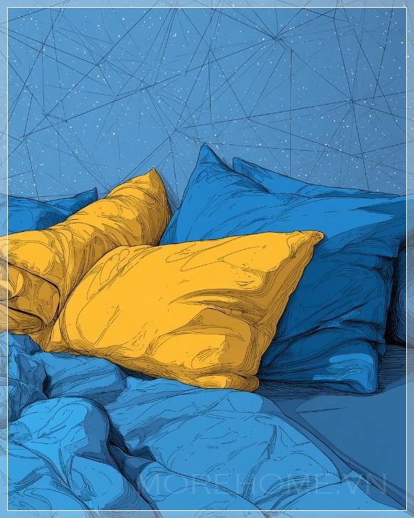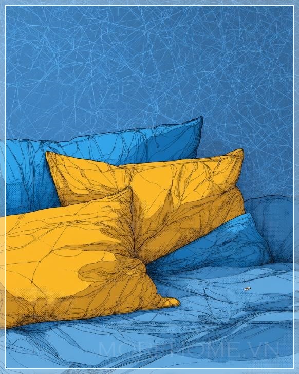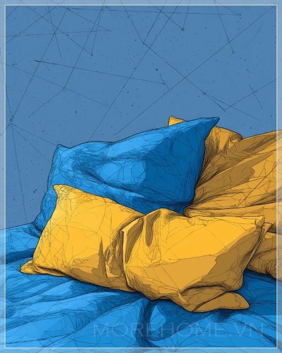 Phía sau chiếc gối, một nền mạng lưới trừu tượng trải dài, như thể cả không gian xung quanh đang được điều khiển bởi một hệ thống kỹ thuật số ẩn hiện. Những đường kết nối màu bạc ánh lên theo từng nhịp chuyển động tưởng tượng, tạo cảm giác như chiếc gối không chỉ là một vật dụng bình thường mà còn là một điểm kết nối cảm xúc trong thế giới số. Sự tương phản giữa sự ấm áp vật lý của gối và vẻ lạnh lẽo tinh vi của nền mạng khiến cho tổng thể khung cảnh trở nên cuốn hút và độc đáo, như một khoảnh khắc tĩnh lặng giữa những dòng dữ liệu đang chuyển động không ngừng.