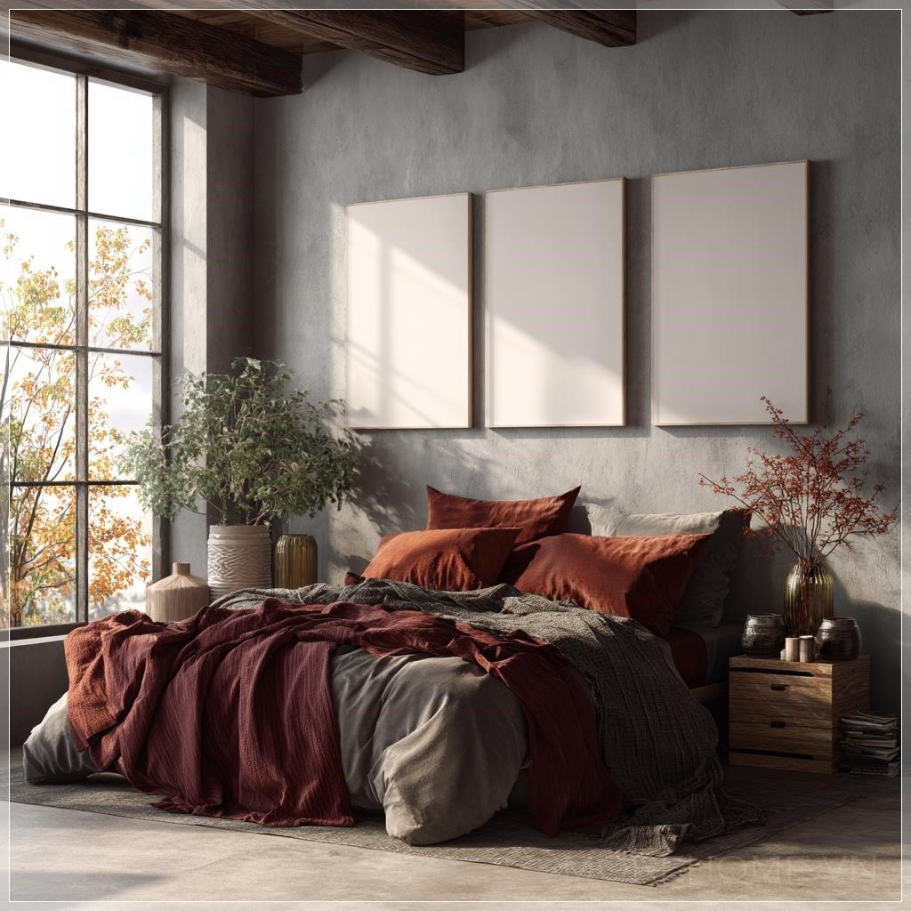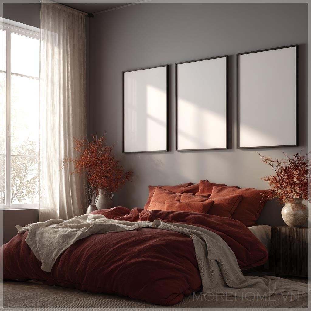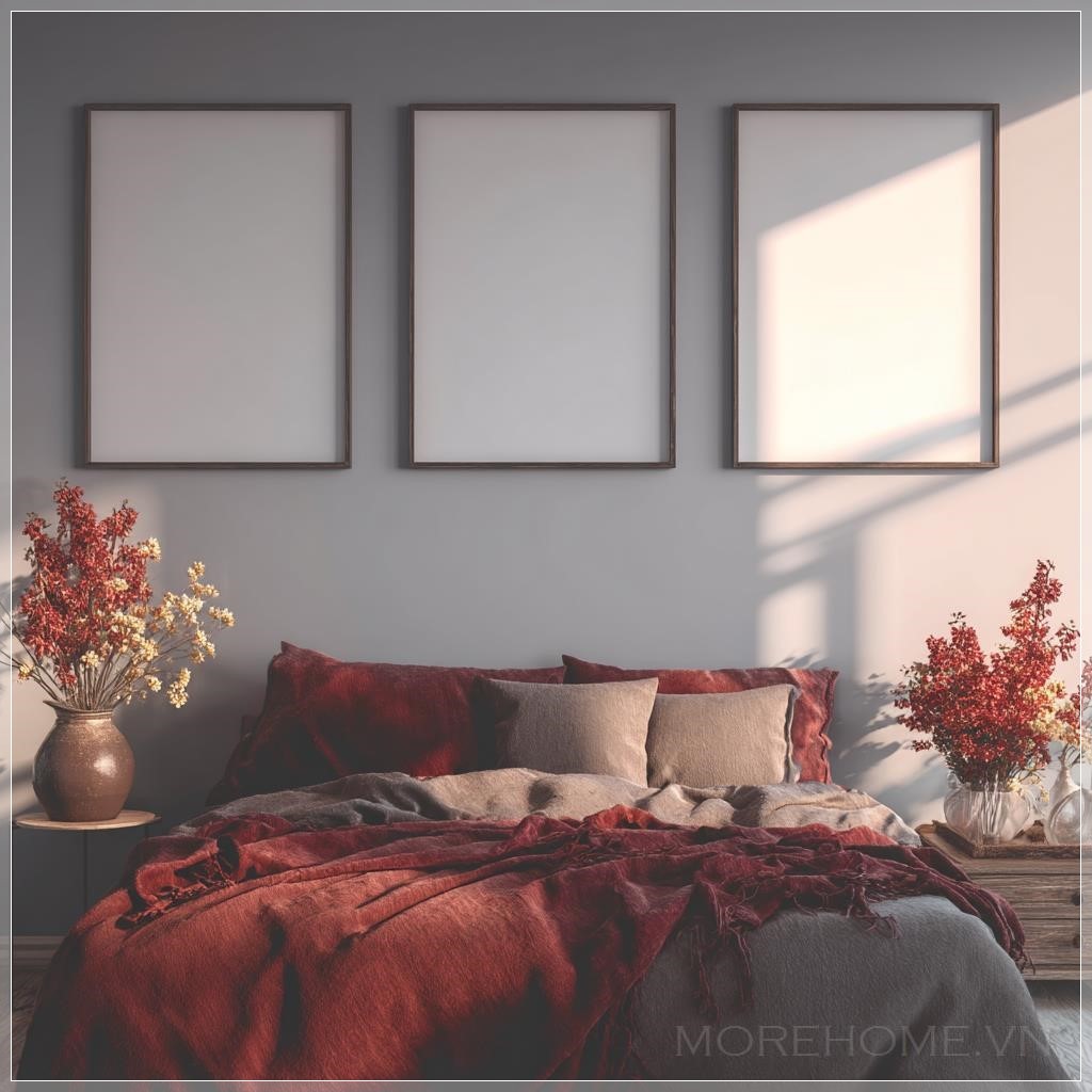 Phòng ngủ trong ví dụ này được tô điểm với ba bức tranh khung trống, những tác phẩm nghệ thuật sẽ hoàn thiện không gian khi được điền vào sau này. Những bức tranh này không chỉ là điểm nhấn về mặt thẩm mỹ mà còn tạo ra sự tự do cho không gian. Giường ngủ với bộ ga giường ấm áp và chăn đệm mềm mại mang đến cảm giác thoải mái, là nơi lý tưởng để thư giãn. Những đường nét tối giản của chiếc giường kết hợp với các chi tiết màu đỏ đậm trên vải giường giúp không gian trở nên sinh động mà không quá rối mắt.