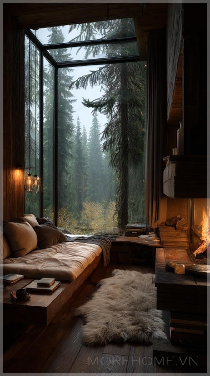 Thiết kế nội thất trong một không gian đặc biệt như một căn phòng trong khu rừng tối có thể tạo ra một bầu không khí thư giãn và ấm cúng đầy lôi cuốn. Sự kết hợp giữa các vật liệu tự nhiên như gỗ và các yếu tố ánh sáng ấm áp chính là điểm nhấn trong không gian này. Với những chi tiết sắc nét trong từng đường nét thiết kế, từ chiếc giường sofa dài màu trắng mềm mại cho đến những cây thông lớn bên ngoài cửa sổ, mọi thứ tạo nên một cảnh quan không thể thiếu trong thiết kế đương đại.