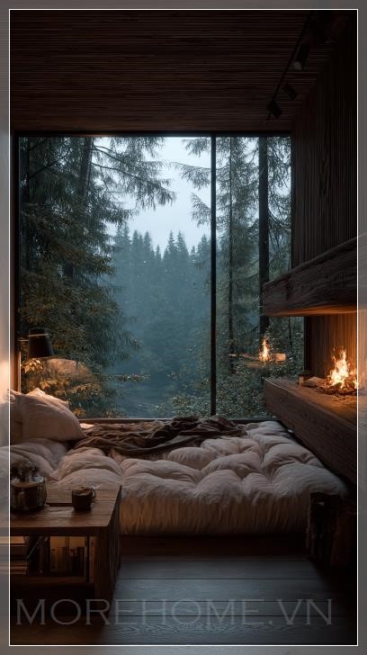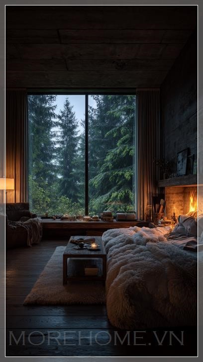 Với không gian như vậy, những ứng dụng thực tế là vô cùng phong phú. Trong các thiết kế nội thất hiện đại, đặc biệt là các căn hộ hoặc nhà ở khu vực có khí hậu lạnh, việc sử dụng gỗ tự nhiên kết hợp với ánh sáng nhẹ nhàng là một giải pháp lý tưởng. Các vật liệu tự nhiên không chỉ mang lại sự bền vững mà còn tạo nên một không gian gần gũi với thiên nhiên. Một căn phòng ngủ được thiết kế như vậy không chỉ đáp ứng nhu cầu nghỉ ngơi mà còn là một không gian thể hiện phong cách sống của chủ nhân. Gỗ tự nhiên, ánh sáng ấm áp từ lò sưởi, và những cửa sổ lớn không chỉ là sự lựa chọn về mặt thẩm mỹ mà còn giúp tăng cường sự kết nối với thiên nhiên, tạo nên một không gian lý tưởng cho những người yêu thích sự yên tĩnh và thư giãn.
