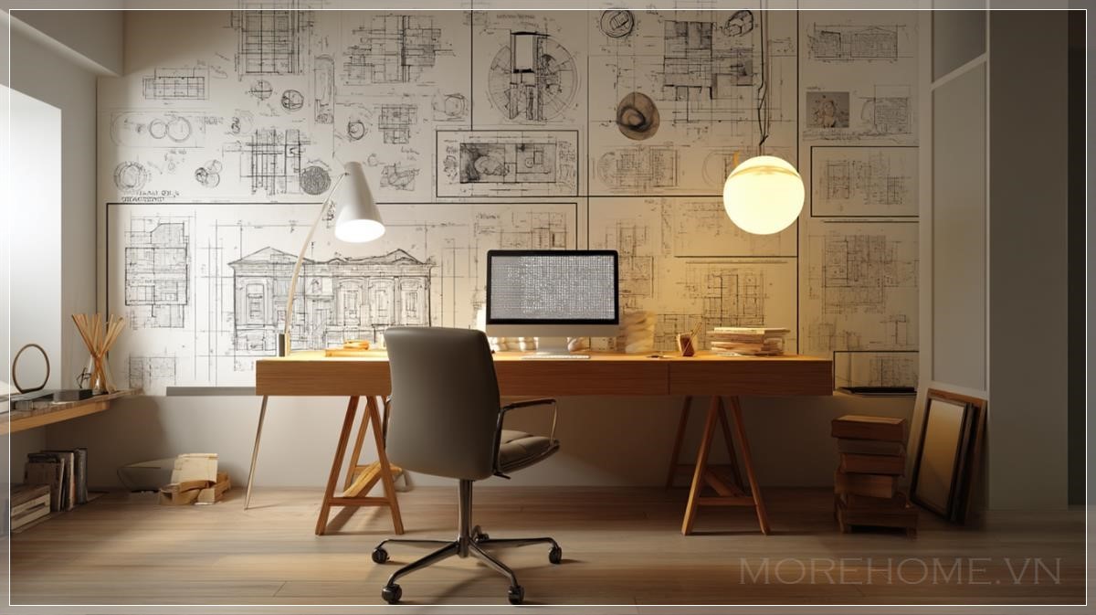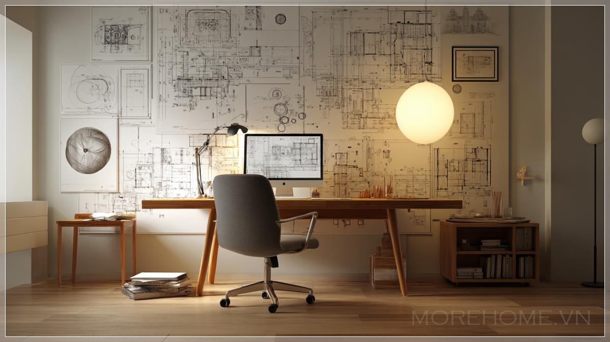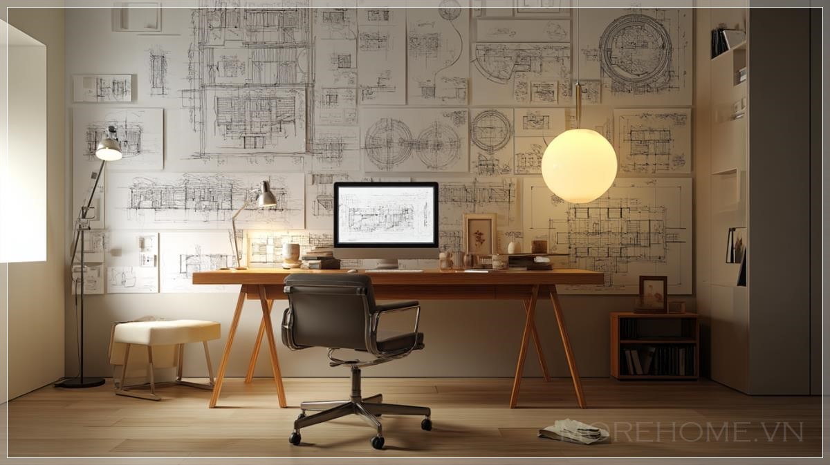 Trên chiếc bàn gỗ giản dị là những bản vẽ thiết kế và sơ đồ kiến trúc, phản ánh công việc thường xuyên của một nhà thiết kế. Màn hình máy tính đang bật, phản chiếu ánh sáng ấm áp, tạo ra một bức tranh nhẹ nhàng và cuốn hút. Mặc dù không gian có vẻ gọn gàng nhưng lại có sự ngẫu hứng trong cách bố trí, với những bản vẽ được để rải rác, mang lại cảm giác chân thật và sống động. Đây là một không gian không chỉ để làm việc mà còn là nơi để truyền cảm hứng cho các ý tưởng sáng tạo, thể hiện cá tính của người sử dụng.
