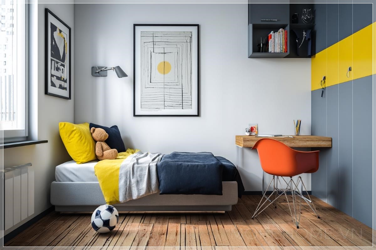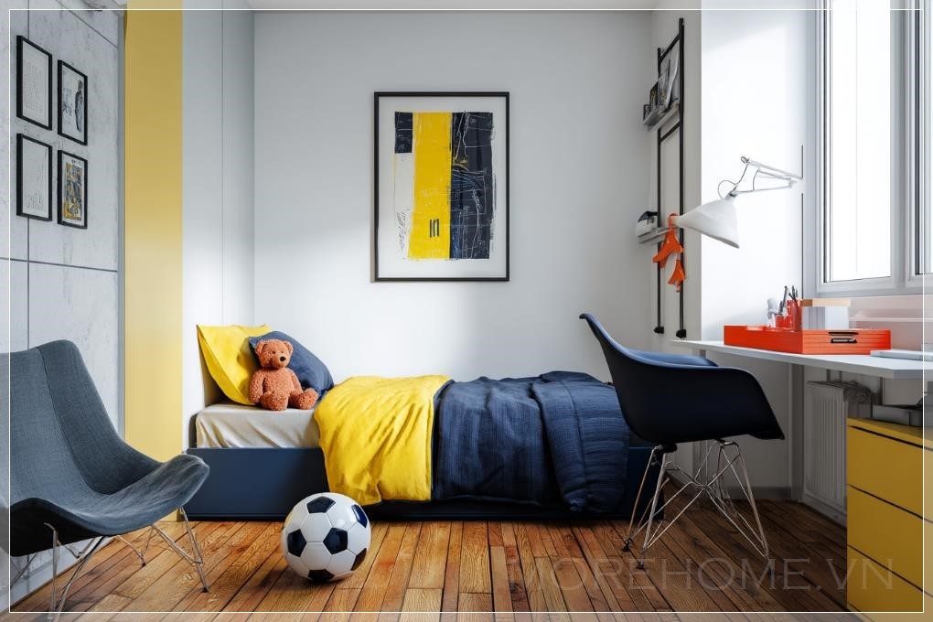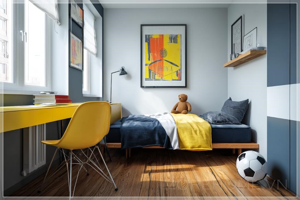 Điều đầu tiên cần chú ý khi thiết kế phòng trẻ em là sự kết hợp màu sắc. Với bảng màu chủ đạo là xanh navy, đen, vàng và trắng, không gian phòng ngủ này không chỉ tươi mới mà còn đầy sức sống. Màu xanh navy và đen mang lại cảm giác mạnh mẽ và cá tính, trong khi màu vàng tươi sáng giúp cân bằng và tạo điểm nhấn. Màu trắng của tường kết hợp với màu sắc của các món đồ nội thất như bàn, ghế, và giường sẽ làm nổi bật lên những chi tiết trang trí thú vị, tạo nên không gian sống động nhưng không kém phần tinh tế.