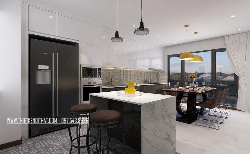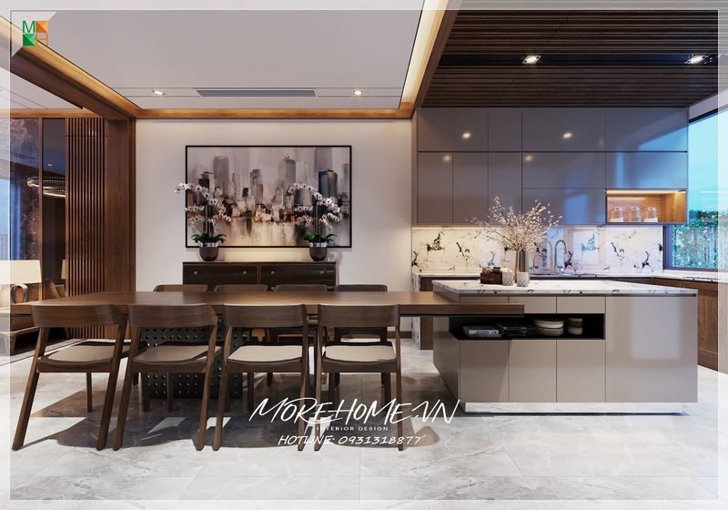 Phòng bếp lồng phòng ăn tạo nên sự thông thoáng, tiện nghi nhưng đẹp, sang trọng tại biệt thự hiện đại Xuân Phương.