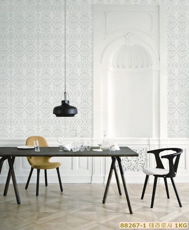 Giấy dán tường tân cổ điển màu trắng kết hợp cùng họa tiết hoa văn tạo ra sự sang trọng cho không gian phòng khách