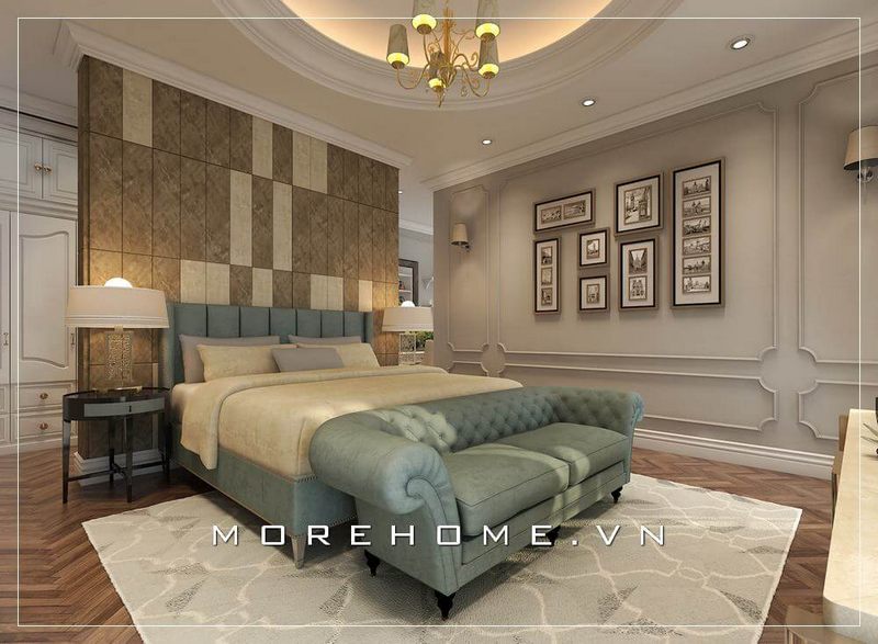 Thiết kế phòng ngủ bố mẹ đẹp đầy sang trọng, chiếc giường ngủ bọc nỉ màu xanh trở thành điểm nhấn ấn tượng cho cả căn phòng thêm cuốn hút hơn