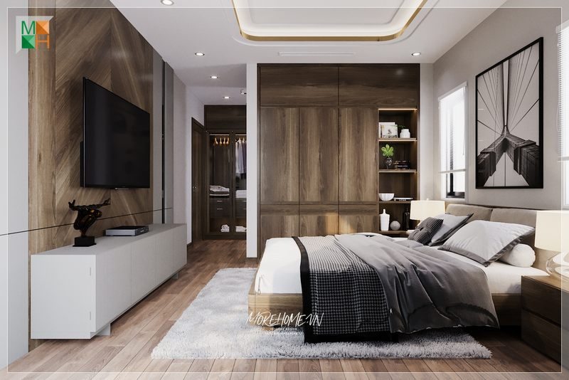Thiết kế nội thất phòng ngủ hiện đại, sàn gỗ màu nâu trầm chủ đạo tạo cảm giác ấm cúng và thoải mái hơn