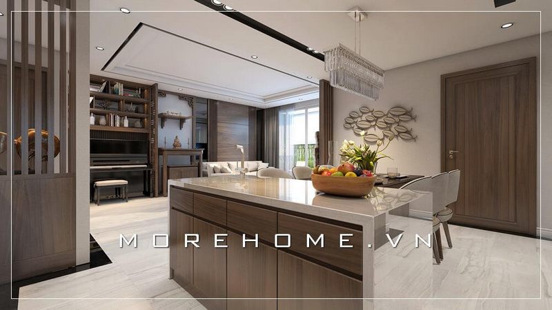Mẫu tủ bàn đảo bếp gỗ tự nhiên hiện đại, mặt bếp ốp đá màu trắng cao cấp cho phòng bếp biệt thự