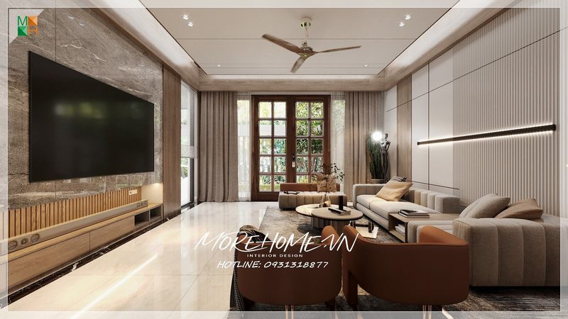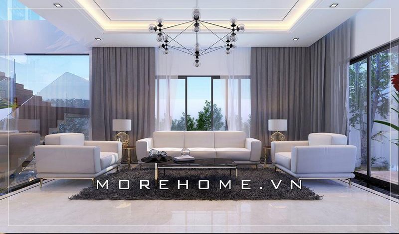 Mẫu thiết kế nội thất phòng khách biệt thự cao cấp với tông màu xám chủ đạo được yêu thích tại MoreHome