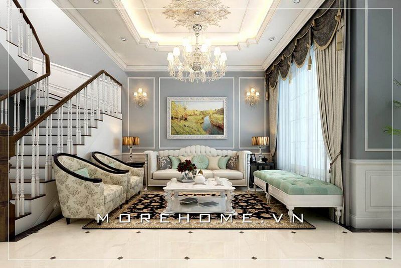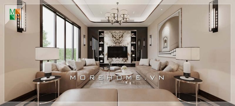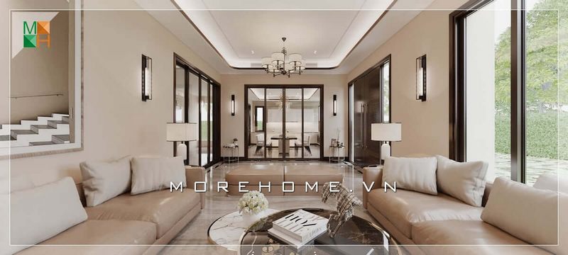 Đường nét tân cổ điển được thể hiện trên mọi không gian phòng khách biệt thự