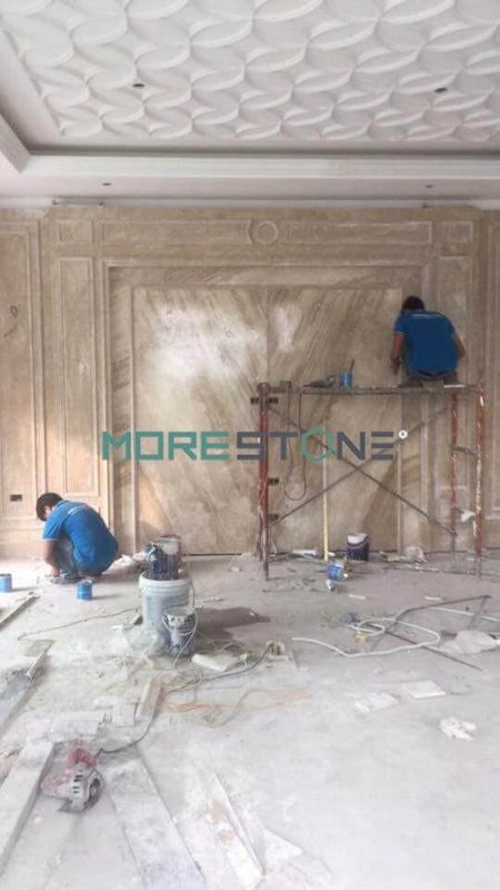 Đá ốp tường phòng khách với vân đối hoàn hảo tôn thêm nét nghệ thuật của không gian tân cổ điển, được Morestone thi công, hoàn thiện theo yêu cầu của từng gia chủ.